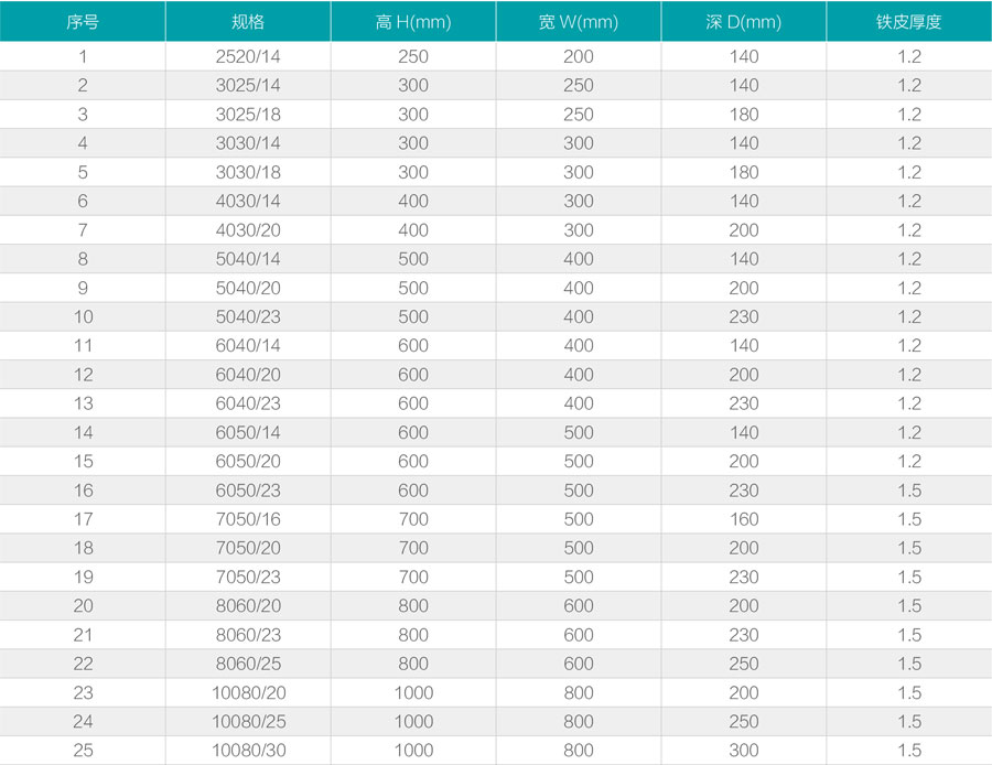 JXF分為外露式和隱蔽式兩種,JFF分為金屬門和透視窗門。門板上貼有密封膠條,防止雨水滲入。箱體上設有上、下進、出水孔和安裝底板。進出口孔在出廠時已安裝密封板,門扇開啟角度大于90度。JXF、JFF有25種規格,JFF2有18種規格(5040/14以上起)。